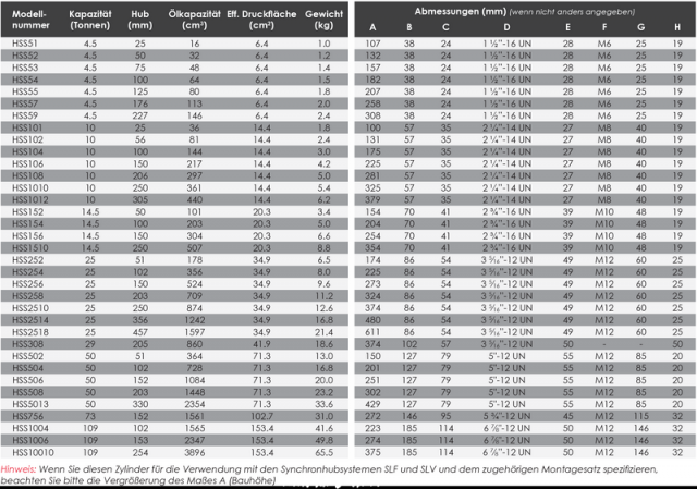 HI-FORCE HSS55 Einfachwirkende Mehrzweck-Zylinder, Allzweck-Hydraulikzylinder (4.5T, 125mm)• Kapazität von 4.5 bis 109 Tonnen• Hublänge von 25 bis 457 mm• Betriebsdruck 700 bar• Einfachwirkend, Federrückzug• Nitrocarburierte Kolbenstangen füreinen höheren Korrosionsschutz• Reibungsarme Auflagefläche• Anti-Extrusionsdichtungen für verbesserteLeistung bei hoher Druckbelastung• Kragengewinde sind für volle Belastung ausgelegt• Gerillte Druckstücke bei allen Modellenserienmäßig montiertTechnische Parameter: Modell: HSS55 Druckkraft: 4.5 T Hub: 125 mm Ölvolumen: 80 cm3 Eff. Druckfläche: 6,4 cm2 Gewicht: 1,8 kg Versand volumen: 25x15x15 cm